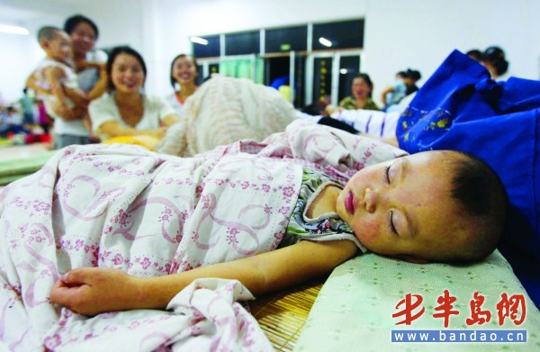 21時10分許,記者來到嶗山六中食堂內,被轉移到這里的 356名漁民及家屬有的在打撲克,有的已經進入了夢鄉,一些耐不住寂寞的小朋友也開始玩起了游戲。漁民王師傅介紹,轉移到這里的漁民大都是四川籍的,從中午開始轉移,到晚上7時多,社區工作人員和學校老師為漁民們分發了面包和礦泉水。