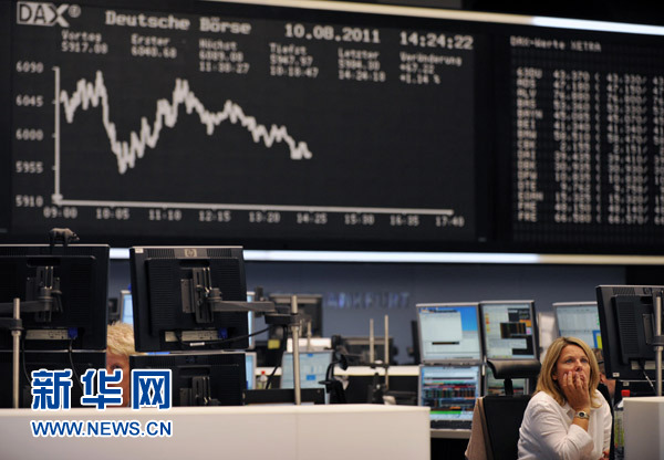 8月10日,交易員在德國法蘭克福證券交易所工作。當日,德國法蘭克福股市DAX指數在前一交易日微跌0.10%之后,繼續大跌303.66點,收于5613.42點,跌幅達5.13%,這已經是法蘭克福股市DAX指數連續11個交易日下跌。新華社記者馬寧攝