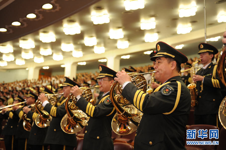 7月1日,慶祝中國共產黨成立90周年大會在北京人民大會堂隆重舉行。這是軍樂隊演奏國歌。 新華社記者 謝環馳 攝
