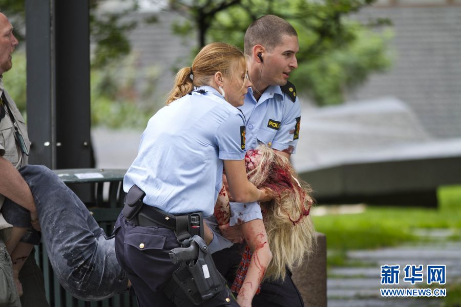 7月22日,在挪威奧斯陸市,警察從爆炸現場抬出一名受傷人員。奧斯陸市中心當日發生爆炸,造成數人受傷。 新華社/法新