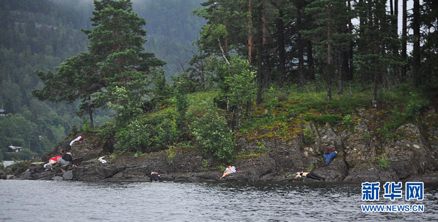 7月22日,在挪威于特島,槍擊事件受害者躺在礁石上。