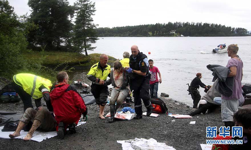 7月22日,警察在挪威于特島對槍擊事件中的傷者實施救援。 新華社/法新