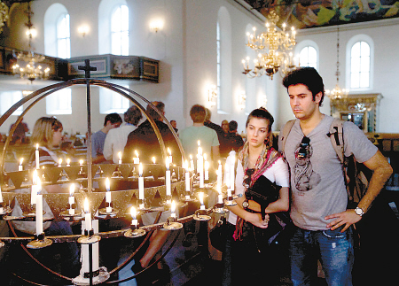 人們在挪威首都奧斯陸大教堂里點燃蠟燭,對襲擊事件中的遇難者表示哀悼。 新華社發