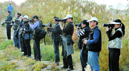 “長(zhǎng)槍短炮”瞄準(zhǔn)沙湖。 本報(bào)記者 蘇保偉 左鳴遠(yuǎn)/攝