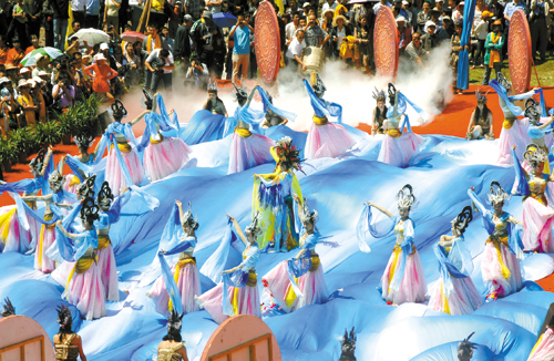 7月19日,首屆中華母親節暨第三屆王母故里敬母大典在我省湟源縣宗家溝景區舉行。圖為敬母大典上《王母頌》大型實景樂舞表演。 祁國彪/ 攝 西海都市報