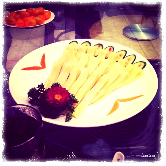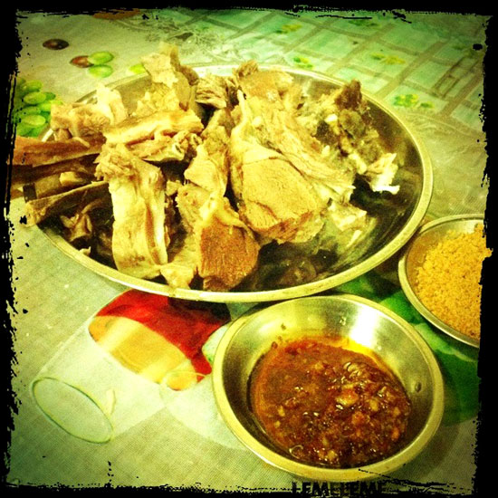 基本上就是白水煮就,涼之,切條,以手取之,蘸之各類調(diào)味料。當?shù)厝诉有一句老話奉送:吃肉不吃蒜,營養(yǎng)少一半。