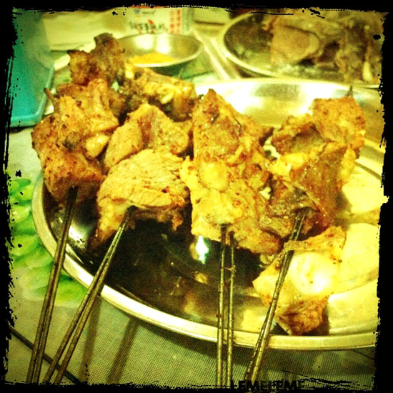 相對迷你些的羊肉串也是北方3倍大,看出來當?shù)夭蝗毖蛉饬恕?/P>