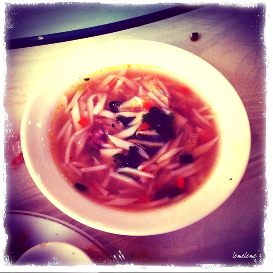 面皮切成細小菱形小片兒,熗鍋,有青菜似乎還有肉沫。口味兒有點酸,面香滑,在啃完一塊牦牛排骨之后,我又喝了兩碗。很沒出息。