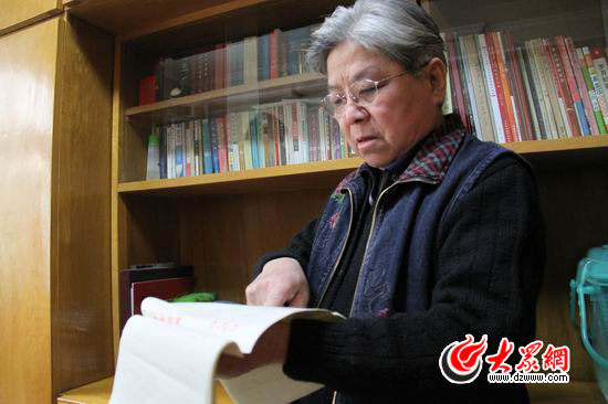 徐淑英老人翻看自己丈夫留下的回憶錄手稿。
