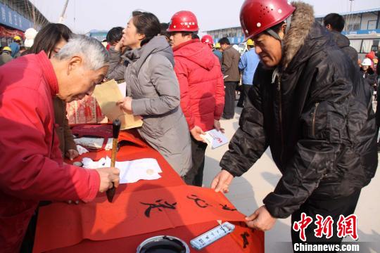 中新網濟南12月27日電(孔凡元)“出來務工一年了,春節將至,越來越思念家人。人生第一次近距離的觀看藝術大師們在農民工工地現場寫書法、作畫,現場觀看明星大腕的文藝演出,心情很激動,希望政府多關注農民工,多搞一些近距離的"送溫暖"活動,使農民工兄弟為城市的建設更好的"增磚添瓦"。 ”濟南高鐵西客站務工人員朱太福27日在工地現場興奮地告訴記者。