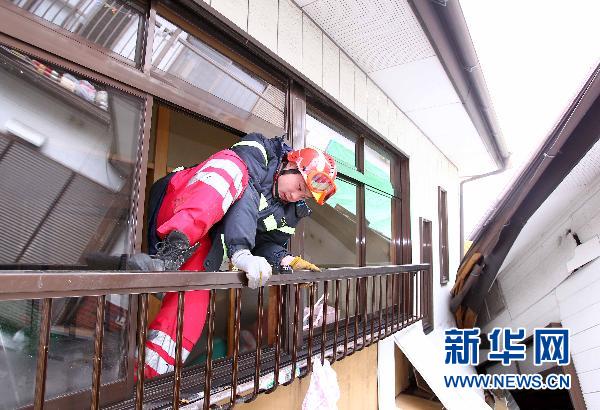 3月16日,在日本宮城縣大船渡市重災區,一名中國國際救援隊隊員對一處廢墟進行排查后從窗口爬出。