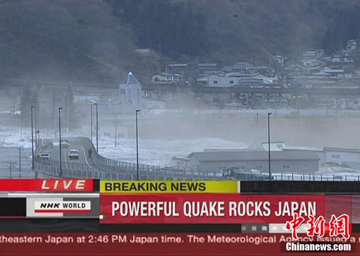 中新網3月11日電 據共同社報道,當地時間3月11日下午,日本東北地區以宮城縣為主的地方發生里氏8級以上強震,并引發大規模海嘯,截至目前,地震和海嘯已造成至少32人死亡,30多人失蹤,一艘載有約100人的船只被大浪卷走,宮城縣一處空軍基地已基本被淹沒。