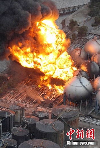 日本近海3月11日發(fā)生了強(qiáng)烈地震,首都東京震感強(qiáng)烈。日本氣象廳隨即發(fā)布了海嘯警報(bào),稱(chēng)地震將引發(fā)約10米高海嘯。圖為日本千葉縣市原市煉油廠儲(chǔ)油罐發(fā)生連環(huán)爆炸。