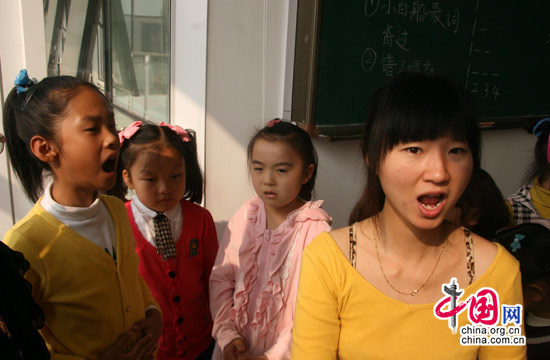 適逢周末,青島城陽百姓樂園內開展了各種興趣學習班,圖為老師正在教小孩子們學習聲樂。(中國網 傅陽 攝)