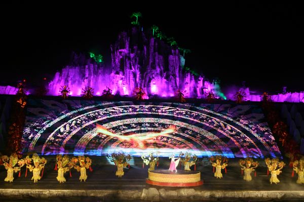 《蒙山沂水》主舞臺搭建在美麗的沂河湖心島上,東西長120米,南北寬60余米,舞臺最高處近30米,主舞臺及舞臺前水面占地8000余平方米,可同時容納觀眾2000余人,兩期工程共計投資6000余萬元。