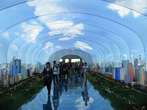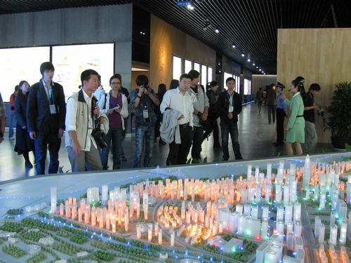 在采訪中記者看到,由全LED燈組成的“大美臨沂”規劃效果圖在6分鐘的時間內,通過明暗組合、聲光結合,介紹了臨沂市10年的城市總體規劃,最讓記者感到驚喜的是館內的環型“水幕長廊”,記者們漫步于“沂河水面”之上,頭上是藍天白云,河兩岸是規劃中的建筑模型,順著河面前行,就能看到與實際建筑成比例的電視塔、“帆船”樓,沂河兩岸的都市風景盡收眼底。