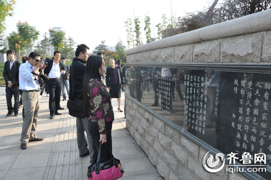 齊魯網10月19日訊 今天下午,第七屆中國網絡媒體山東行的記者來到了臨沂市區著名的書法廣場,感受書法藝術所給予的感官魅力。從王羲之的《蘭亭集序》到蘇軾的《寒食帖》,從古至今、包羅華夏的書法藝術作品系數呈現。各式各樣別具風格的石碑錯落有致的擺放于廣場之內,演繹了自龍山文化陶文字型開始5000余年中國書法文化發展史,充分展示了中國書法博大精深和高深造詣。