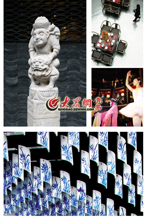 入門,橢圓型的餐廳建筑與綠竹、流水渾然一體,頗有遠(yuǎn)古氣息,內(nèi)部大廳布置古色古香,而包間布 置卻又別有洞天,現(xiàn)代抽象派設(shè)計(jì)痕跡自然充斥其間,與古雅裝飾相得益彰。走到土樓的門口左右,各擺 放了一尊拴馬石,拴馬石是陜西省渭北高原農(nóng)村古代的一種裝飾造型與實(shí)用功能相結(jié)合的范例,石材精雕 而成,石柱上部雕刻的人物和猛獸,造型各異,形象生動(dòng),可謂妙不可言。進(jìn)入土樓內(nèi),皮影、繡花簾子 以及擺放的膠東布老虎,都是中國(guó)古代文化的代表。內(nèi)部擺設(shè)的桌椅門柜全都是中國(guó)古代的風(fēng)格,一樓散 桌中的舞臺(tái),每晚都會(huì)上演皮影戲、膠州秧歌、茂腔、古箏和二胡演奏等中國(guó)經(jīng)典的文藝表演,在樓上幽 雅的包間,推窗而望可見清潭蓮花,屋頂上吊著的一片片青瓦,圓桌上一道道細(xì)致又精美的魯菜,美食、 美景,輕松的享受這美妙的生活。