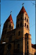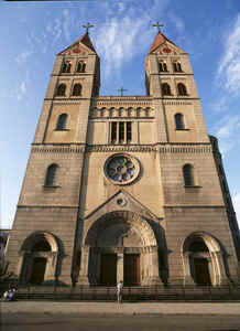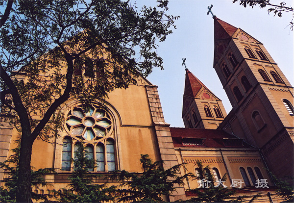 青島天主教堂本名圣彌厄爾教堂,由德國設計師畢婁哈依據哥德式和羅馬式建筑風格而設計。擬建教堂應高百米,適逢二戰爆發,希特勒嚴禁德國本土資金外流,該教堂不得不修改圖紙,即建成現在規模。教堂始建于1932年,于1934年竣工。占地面積11480平方米,其中建筑面積6301.54平方米。教堂平面呈拉丁“十”字形,正面高30米處設有平臺,兩側有兩座對稱而又高聳的鐘塔,高度為60米,塔內上部懸有4個巨大銅鐘,鐘聲悠揚和諧。大門上方有一巨大的玫瑰窗,兩側各聳立起一高4.5米的十字架。該堂結構以鋼筋混凝土與花崗石結合而成。屋頂覆蓋舌頭紅瓦,其氣勢龐大,且又古樸典雅。 教堂裝飾系采用意大利文藝復興時期形式。堂內大廳高18米,寬敞明亮,頂棚懸有七個大吊燈,后方設有祭臺,配之穹頂的圣像壁畫,堪稱莊嚴美觀?扇菁{教徒千人,是青島地區最大的哥特式建筑,也是中國唯一的祝圣教堂,同時也是基督教建筑藝術的杰作。 文革時,教堂受到嚴重破壞,1981年4月恢復使用,列為省級重點文物保護單位。
