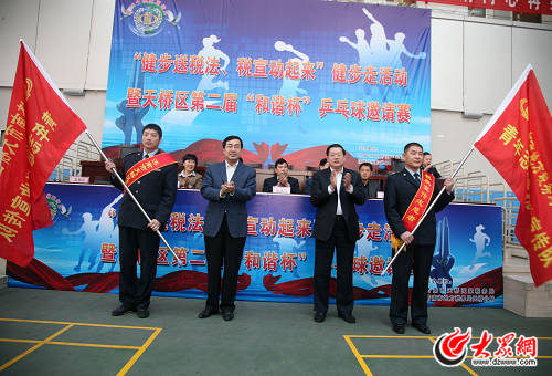 大眾網訊(通訊員 祝雷、楊明良)4月27日上午,天橋國地稅聯合在天橋文體活動中心舉行隆重又熱烈的“健步送稅法、稅宣動起來”為主題的健步送稅法啟動儀式,天橋國地稅干部職工、綜合治稅人員60余名同志組成方陣參加了活動。