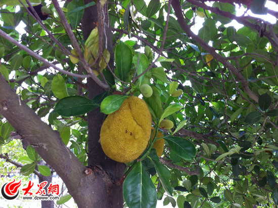 園里行道樹上,一個菠蘿蜜正在生長。(李冉 攝)