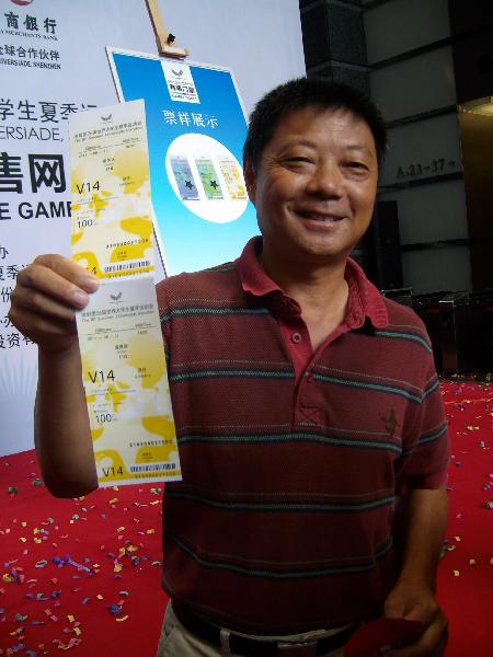 7月11日,第一個購買到深圳大運會賽事門票的深圳市民林先生高興地展示門票。當日,深圳第26屆世界大學生夏季運動會開始面向公眾發售至少180萬張門票,占深圳大運會總票量的65%。大運會門票票價從30元到300元不等,此外還專設10元的學生票。新華社記者詹奕嘉攝