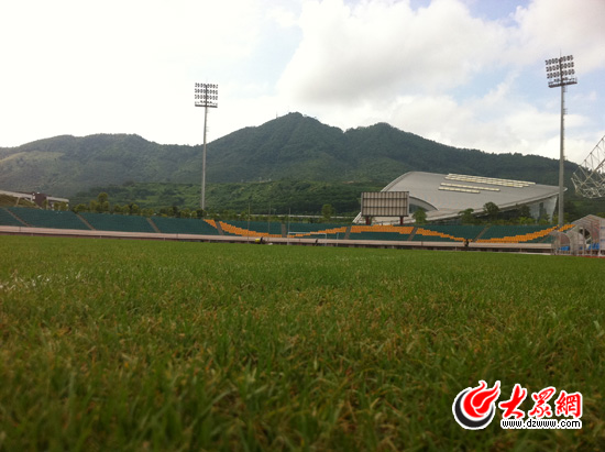 遠處的青山與綠色天然草皮,給運動員視覺的享受。(杜福 攝)