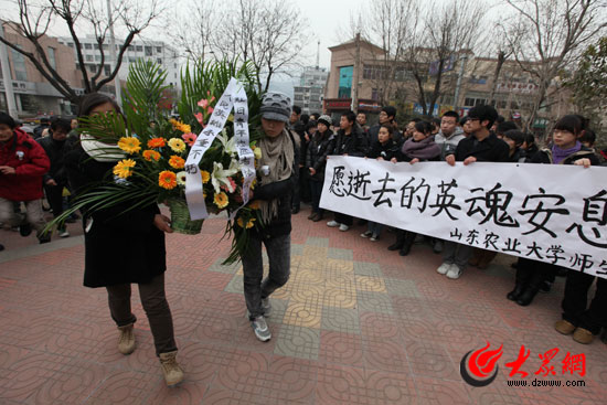 在龍潭路發生槍擊的現場,很多白色和黃色的鮮花擺在路邊。“灑一腔熱血 鑄泰山英魂”,白底黑色大字莊嚴肅穆。山東農業大學自發組成祭奠團隊,哀悼殉職民警和協警。“事件就發生在我們身邊,他們用自己的鮮血守護著泰城的安寧,他們是最可愛的人。”一名女大學生把自己寫好的挽聯放在鮮花上。