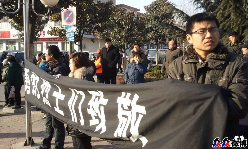 很多市民自發聚集在泰山劇院門前,手握沉痛悼念英雄的黑色橫幅
