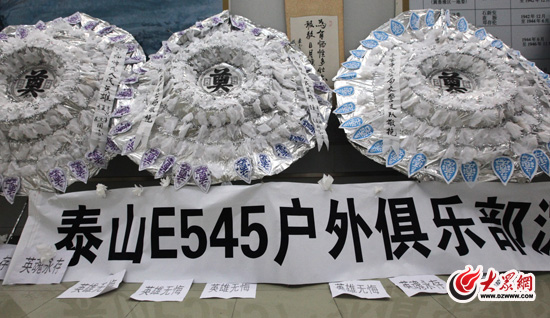 “昨天得知悼念活動后,我們在網(wǎng)上發(fā)起了悼念。”在悼念現(xiàn)場,網(wǎng)友“老男人”告訴記者,他是泰安E545戶外論壇的成員,最近幾天大家一直被英雄們的事跡感動著,昨天得知悼念活動后,大家在網(wǎng)上通過發(fā)帖等形式發(fā)起了悼念活動,并連夜自制了悼念挽聯(lián)、準備了向英雄敬獻的花圈。