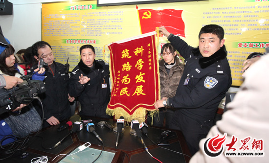 在今天上午的吊唁活動中,來自泰安市泰山區省莊鎮圣元村委會的代表,參加完吊唁后,他們將在兩年前被齊洪海退回的錦旗和牌匾鄭重地交還給了二大隊的民警。在過去三年當中,齊洪海為援建省莊鎮圣元村筑路工程,先后向村委會捐款三次。而村委會為了感謝為村建發展做出貢獻的人員,按規定向村里捐款超出一定份額的人員贈予錦旗和牌匾表示感謝。“可是老齊這個人是個不愛聲張、不愛說話的老實人”,村委會先后征求他意見并贈予他錦旗和牌匾都被他退回了。無奈之下,村委會只能把這兩樣東西保存在了村委會。直到今天,村委會才可鄭重的交還給二大隊。