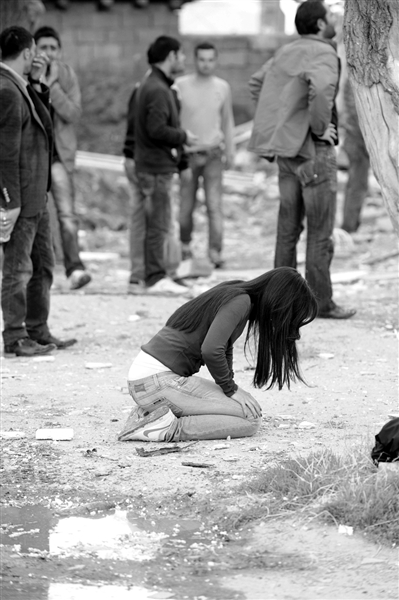 23日,在土耳其東部凡省,一名女子在地震后跪地痛哭。