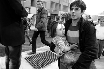 23日,一個土耳其男子抱著地震中受傷的女孩。