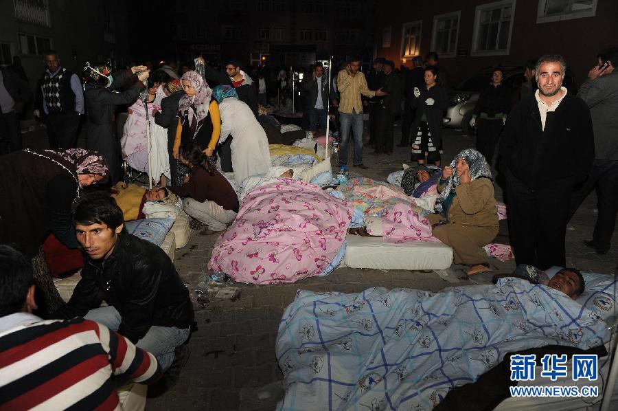 10月23日,在土耳其東部凡省,災(zāi)民露宿街頭。土耳其伊斯坦布爾地震研究中心已將凡省當(dāng)天發(fā)生的地震級別由先前公布的里氏6.6級上調(diào)為里氏7.2級,并估計此次地震可能造成數(shù)百人死亡。新華社/阿納多盧通訊社