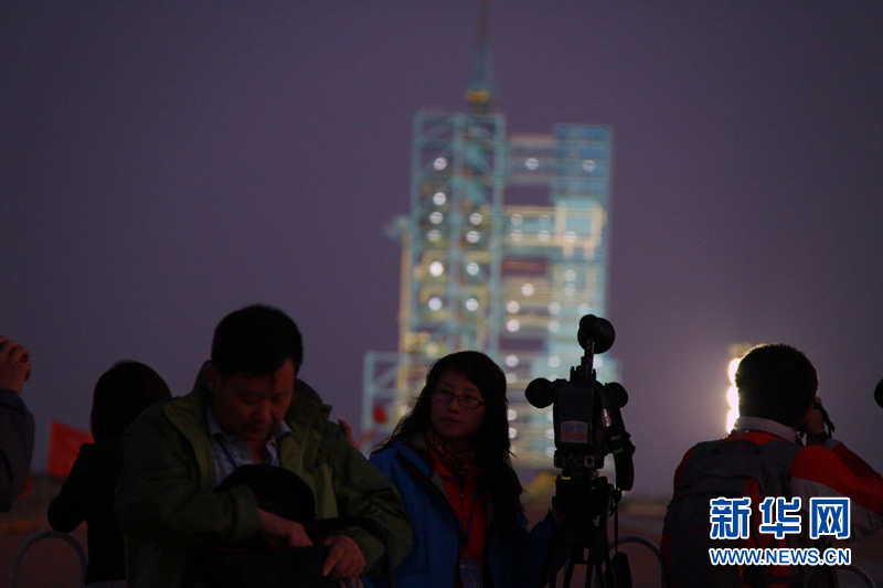 媒體記者到位 夜色下發射架發出水晶般的光芒