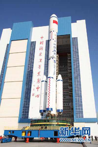 資料圖片:天宮一號目標飛行器、長征二F運載火箭組合體第一次出現在陽光下(9月20日攝)。 9月20日,中國載人航天工程新聞發言人宣布,我國將實施載人航天工程首次空間交會對接任務,執行任務的天宮一號目標飛行器、長征二F運載火箭組合體已從酒泉衛星發射中心垂直總裝測試廠房順利轉運至發射區。 新華社記者 秦憲安 攝