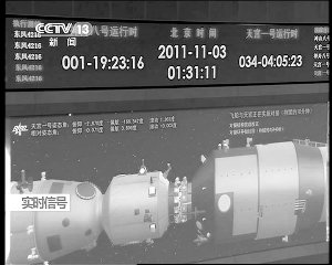 天宮一號與神舟八號陸續進行接觸、捕獲、鎖緊。