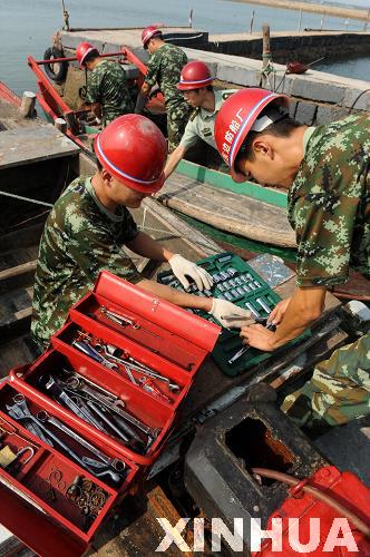 9月5日,船艇修理廠官兵在青島市膠南東山村漁碼頭為漁民維修漁船。新華社記者 李紫恒 攝