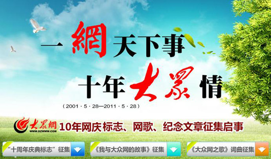 “十周年慶典標(biāo)志”征集設(shè)金獎一名,獎金5000元。作品要求能夠體現(xiàn)“一網(wǎng)天下事,十年大眾情”的主題思想,富有時代感、大氣,形象要簡潔、寓意深刻、設(shè)計感強,能夠展現(xiàn)新聞與網(wǎng)絡(luò)傳媒的特性,給人深刻印象且便于傳播。