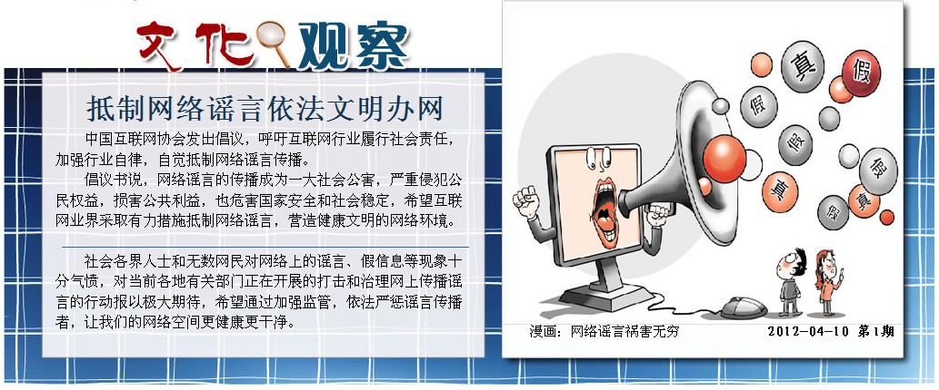 “網(wǎng)絡(luò)上的言論自由不能沒有邊界和限制,不能侵害他人的合法權(quán)益,不能對現(xiàn)實生活和社會形成危害。一個公民在享受網(wǎng)絡(luò)上自由權(quán)利的同時,也要履行義務(wù)自覺維護網(wǎng)絡(luò)秩序。”北京觀道律師事務(wù)所律師程斌說,打擊處理網(wǎng)絡(luò)謠言一方面要強調(diào)他律,另一方面要求網(wǎng)民言行自律,提高網(wǎng)民和網(wǎng)絡(luò)運營者的法律意識和文明素質(zhì)。
