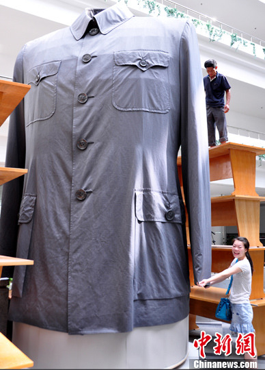 [提要] 9月14日,一件約有兩層樓高的超大型毛料中山裝亮相浙江紡織服裝職業技術學院。9月14日,一件約有兩層樓高的超大型毛料中山裝亮相浙江紡織服裝職業技術學院。這件超大型中山裝衣長4.30米,僅一粒紐扣的直徑就有12厘米,整件服裝的體積約12立方米,尺寸是一般中山裝的6倍,換算成面積就有36倍。