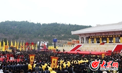 大眾網(wǎng)訊 天地祥,紫氣騰,四海華裔,同祭黃陵。4月5日上午,辛卯(2011)年清明公祭軒轅黃帝典禮在陜西黃帝陵隆重舉行,海內(nèi)外一萬多名中華兒女代表齊聚橋山軒轅殿祭祀廣場,滿懷虔誠地參加公祭典禮,追念人文初祖功德,表達(dá)炎黃子孫追思。