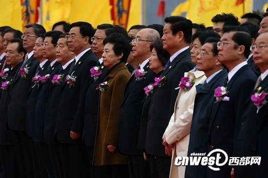 心香一炷,敬獻(xiàn)虔誠。優(yōu)雅的祭樂聲中,全國人大常委會(huì)副委員長、民進(jìn)中央主席、中央社會(huì)主義學(xué)院院長嚴(yán)雋琪,中國國民黨榮譽(yù)主席吳伯雄和夫人戴美玉先后敬獻(xiàn)了花籃。隨后,中共陜西省委書記、陜西省人大常委會(huì)主任趙樂際代表陜西省委、省人大常委會(huì)、省政府、省政協(xié);寧夏回族自治區(qū)黨委書記、自治區(qū)人大常委會(huì)主任張毅,廣西壯族自治區(qū)政協(xié)主席馬鐵山代表兄弟省、自治區(qū)、直轄市;鐵道部黨組成員、副部長彭開宙,國家質(zhì)檢總局副局長蒲長城代表中央國家機(jī)關(guān)和部委;辛卯年年度主祭人,頤和集團(tuán)董事長何建、香港電腦商會(huì)會(huì)長梁定球、澳門地產(chǎn)商會(huì)理事長陳植群代表港澳同胞;馬來西亞韓江電視新聞中心韓江學(xué)院名譽(yù)院長謝詩堅(jiān)、澳洲華人婦女聯(lián)合總會(huì)會(huì)長、愛爾蘭和平統(tǒng)一促進(jìn)會(huì)會(huì)長陳敏琪代表海外同胞;中共陜西省委常委、延安市委書記李希、黃陵縣委書記曹明周代表延安市、黃陵縣,分別敬獻(xiàn)了花籃。