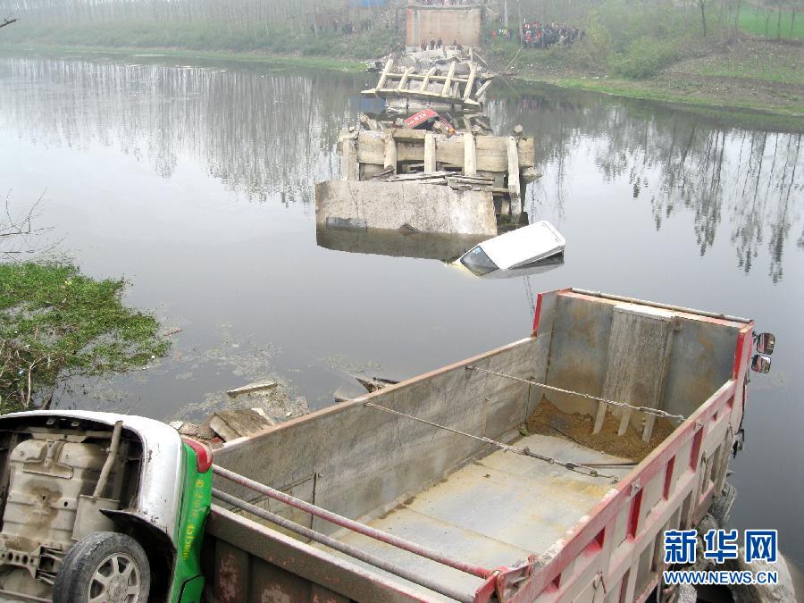 這是11月5日在河南省項(xiàng)城市拍攝的水新公路汾河橋坍塌事故現(xiàn)場(chǎng)。 當(dāng)日早晨5時(shí)許,位于河南省項(xiàng)城市水新公路的汾河橋發(fā)生坍塌事故,造成4輛機(jī)動(dòng)車(chē)落水,其中一輛是滿(mǎn)載沙子的貨運(yùn)卡車(chē)。事故造成2人受傷。據(jù)了解,坍塌橋梁建于1977年,已被當(dāng)?shù)卣袨殡U(xiǎn)橋,事故原因之一初步斷定為貨車(chē)超載。 新華社發(fā)(金月全 攝)
