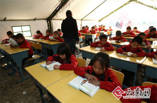 記者:崗勐小學(xué)是震后建成的第一所帳篷小學(xué)。到今天上午,盈江縣已有143所小學(xué)、15所初中、部門高三學(xué)生已經(jīng)復(fù)課。學(xué)校復(fù)課率達(dá)到2/3。到3月21日,學(xué)生將全部復(fù)課。