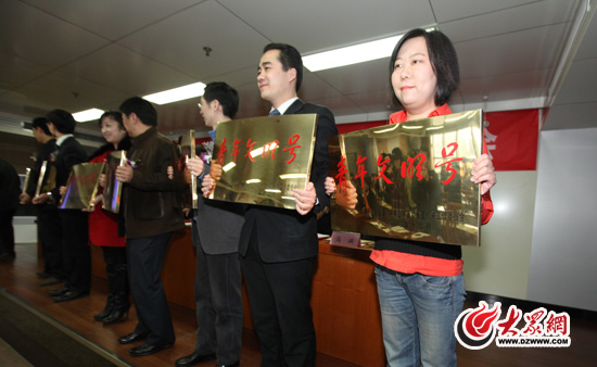 齊魯晚報(bào)青年記者喬顯佳、董釗、魯超國、劉紅杰、劉爽等領(lǐng)取榮譽(yù)證書。