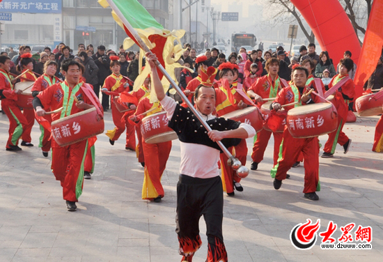 上午10點(diǎn),2011大明湖文化廟會(huì)揭開了大幕。只聽一聲镲響,雄壯的鼓聲頓時(shí)響起。幾十名來自河南的盤鼓藝術(shù)家站成幾列,敲起鼓,打起镲,在“咚咚咚”、“鏘鏘鏘”的節(jié)奏中傳遞出歡快的音符。一名著白黑相間服裝的旗手高舉著大旗,時(shí)而搖擺,時(shí)而晃動(dòng),指揮著整個(gè)鼓隊(duì)的節(jié)奏,鼓手和镲手們臉上格外張揚(yáng)著笑意,探頭、伸手、跳躍,夸張地流露出豪邁的氣勢(shì),單擊、連敲以及間隔的落點(diǎn),無不展現(xiàn)出酣暢淋漓的快感。