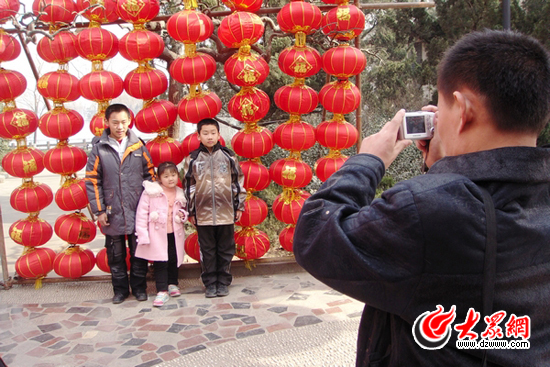 游客在喜慶的大紅色燈籠墻前合影留念。