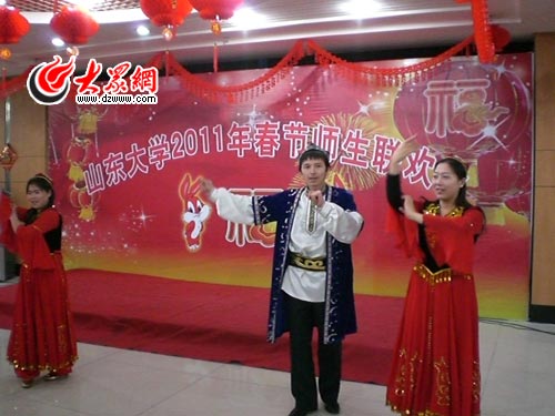 2月1日是農歷的臘月二十九,夜色未到,濟南的上空已經是鞭炮聲聲,年味兒越來越濃了。17:30,記者來到山東大學中心校區,此時的綜合服務樓三層大廳里歌聲、笑聲、歡呼聲響成一片,山東大學2011年春節師生聯歡會正在這里舉行,近200名留守學生與老師們歡聚一堂,共賀兔年新春。