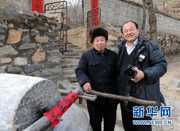 資料圖:新華社記者陳樹根(右)在晉察冀革命老區河北阜平縣花山村與當年和毛主席為鄰的張冀新老人合影。 新華社發(葉燁攝)